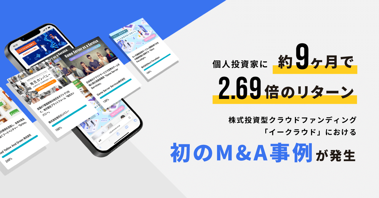 投資から約9ヶ月で個人投資家に2.69倍のリターン。株式投資型クラウドファンディング「イークラウド」における初のM&A事例が発生 – PRTIMES